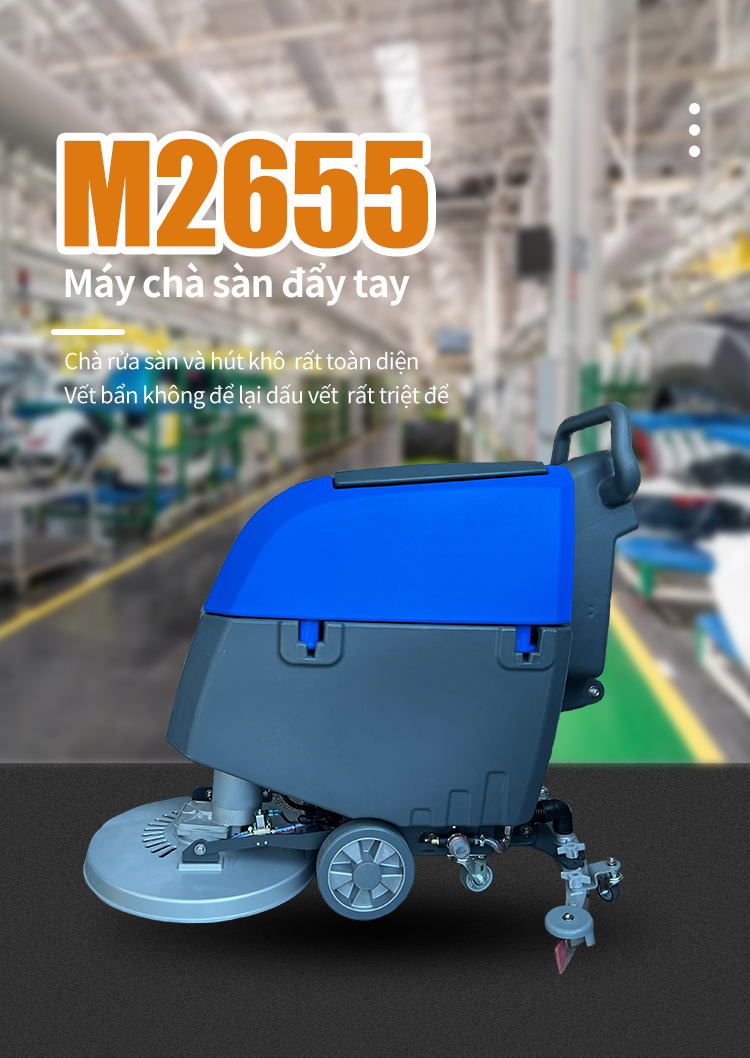 M2655 được trang bị động cơ mạnh mẽ, thời lượng pin dài, chà sạch sâu và hút khô nhanh chóng, giúp mặt sàn luôn sạch sẽ và khô ráo sau mỗi lần làm việc. Máy có thiết kế gọn gàng, dễ điều khiển, phù hợp cho cả không gian rộng và hẹp.