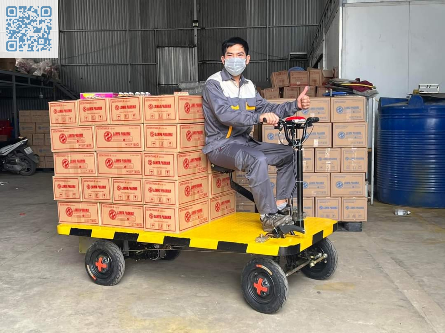 - Xe chở hàng chạy điện với trọng tải 800kg, có 4 bánh xe di chuyển linh hoạt.